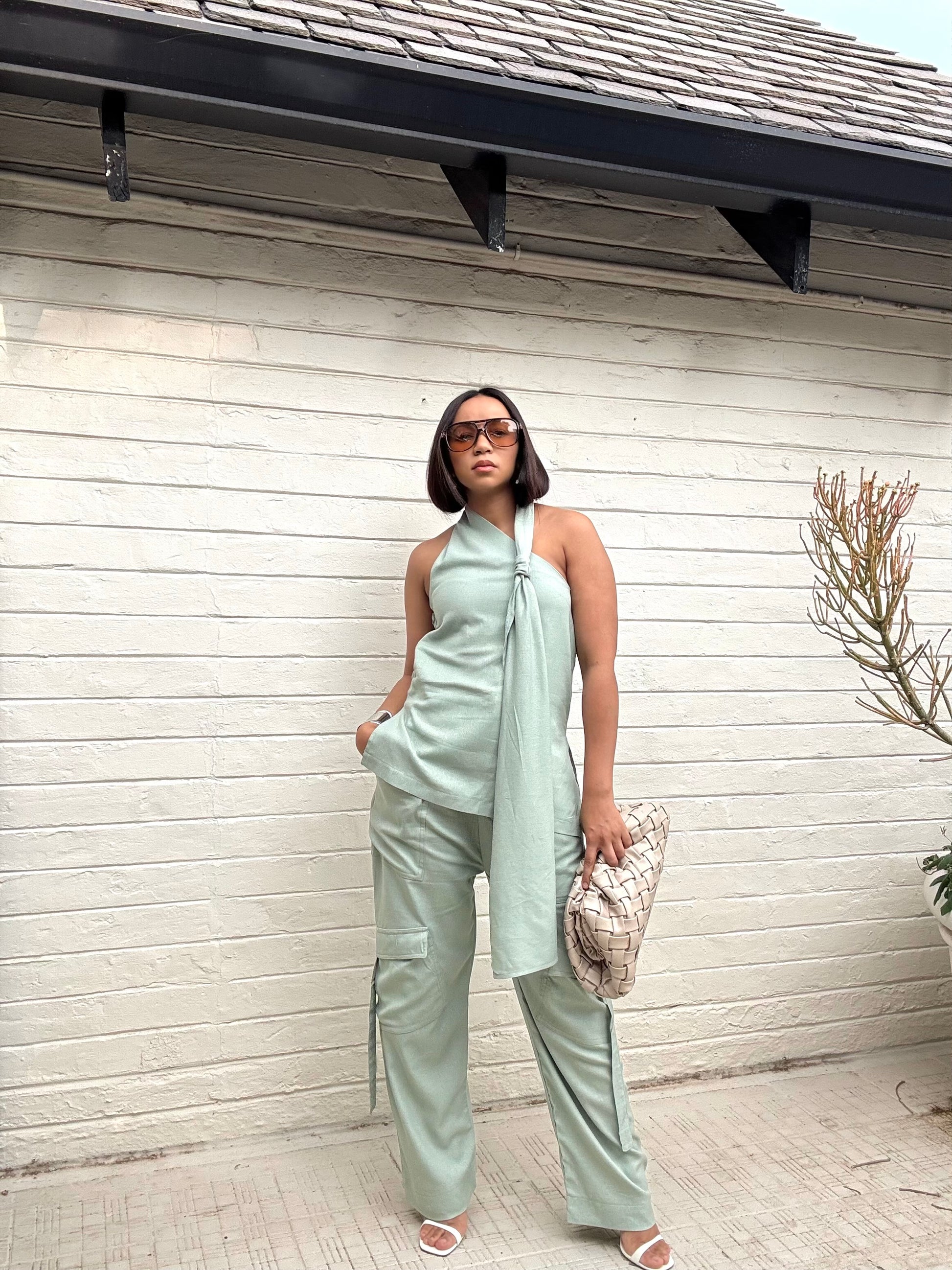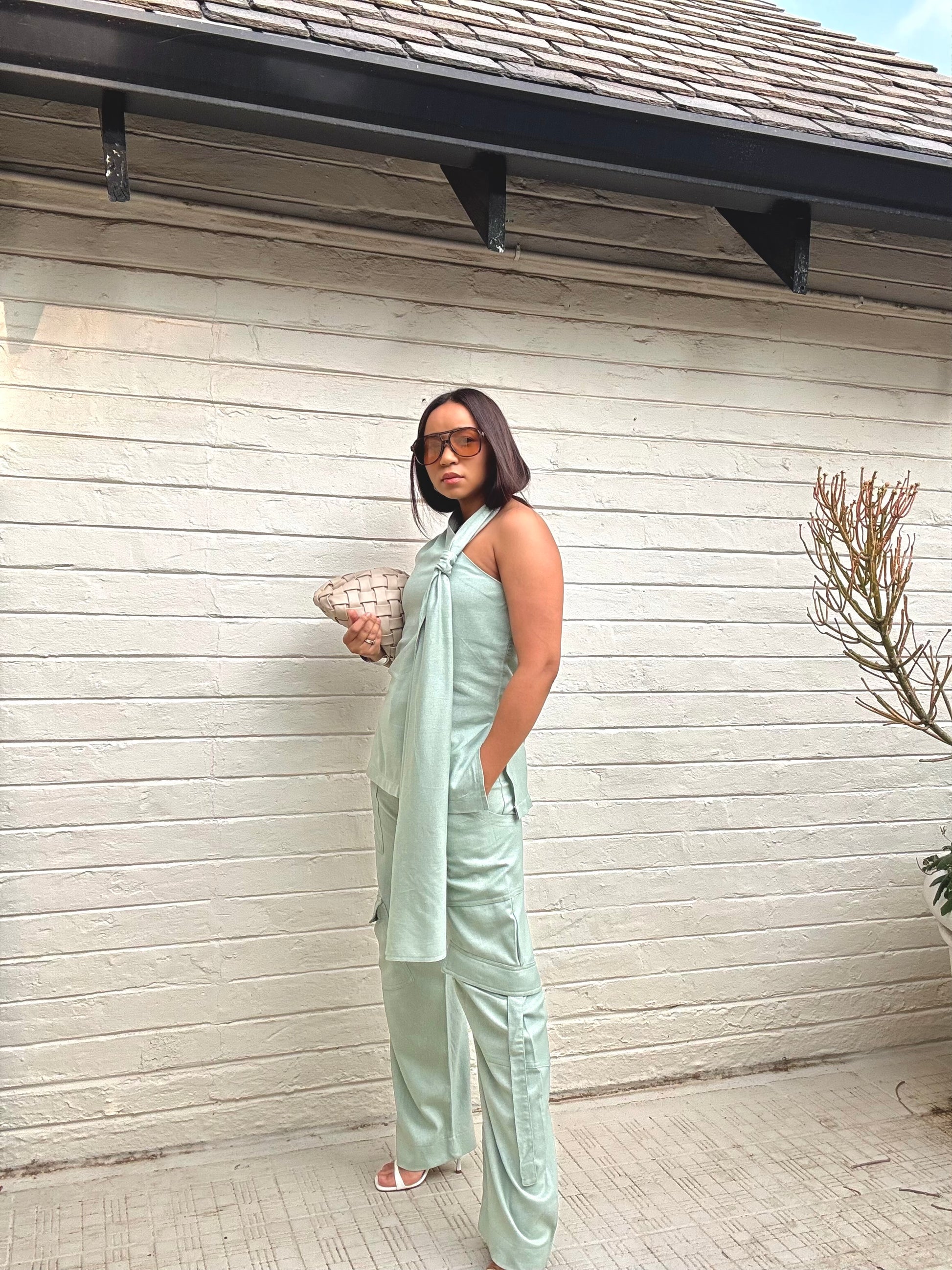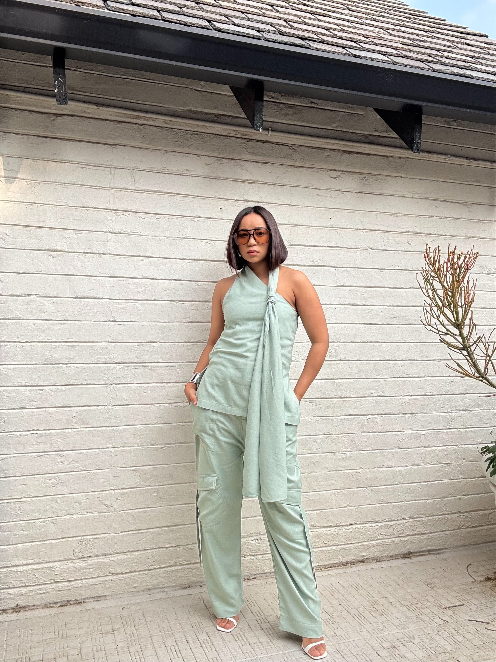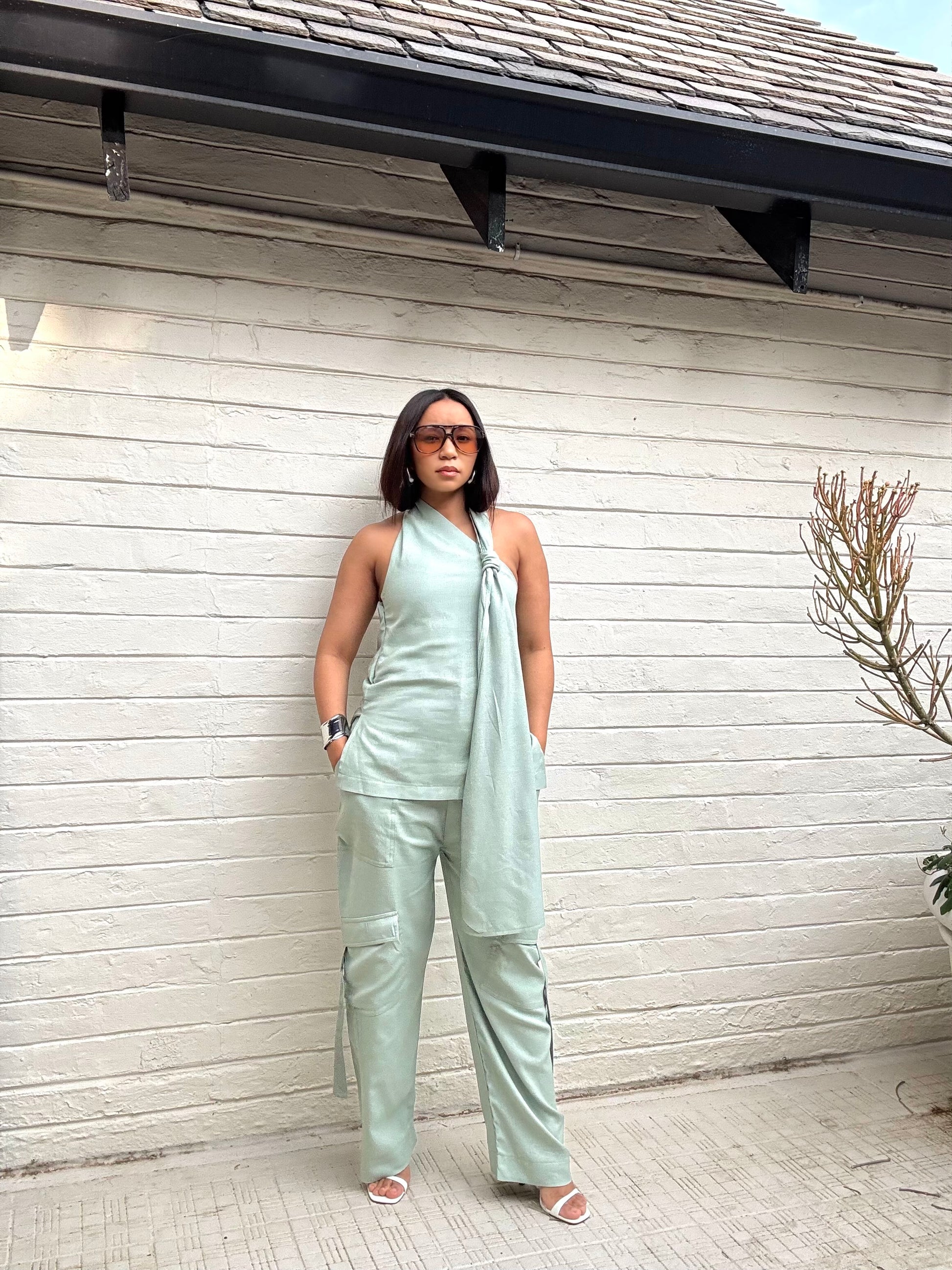 The Pyo - Set is a stylish and versatile outfit, perfect for any occasion. The Walter neck draped scarf top adds a touch of elegance while the high waisted cargo pants provide comfort and functionality. With this set, you'll look effortlessly chic and put together.